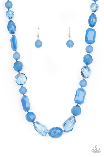 A refreshing collection of opaque, glassy, and acrylic Mykonos Blue beads and accents colorfully links below the collar for a tropical inspired...