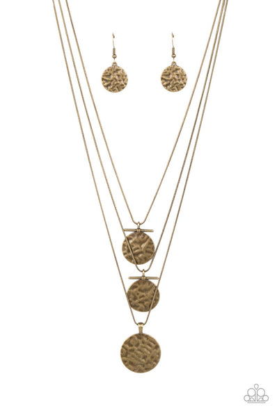 Three strands of skinny brass snake chain fall into tiered layers as they cascade down the chest. Gritty brass discs hammered in...