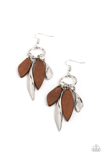 A mismatched collection of asymmetrical brown wooden frames and warped silver petals glide along a silver ring, resulting in an earthy tassel....
