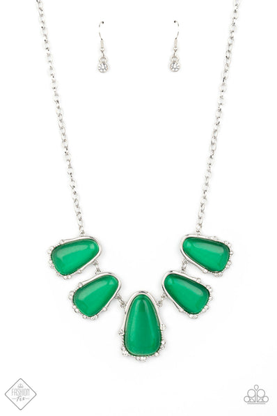 A collection of asymmetrical Mint cat’s eye stone teardrops are encased inside imperfect silver frames as they delicately link below the collar....