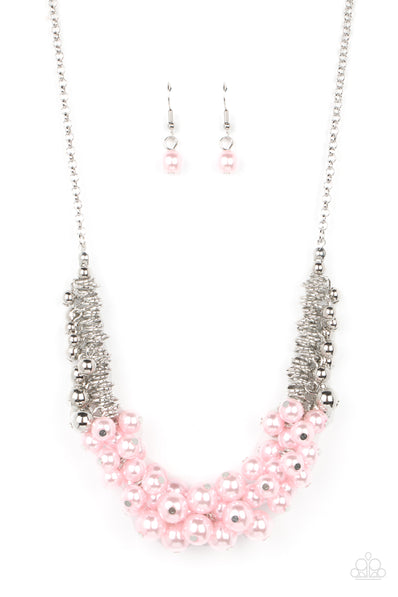 A bubbly cluster of Gossamer Pink pearls are bunched together between hanging silver beads that dangle between jampacked rows of silver rings,...