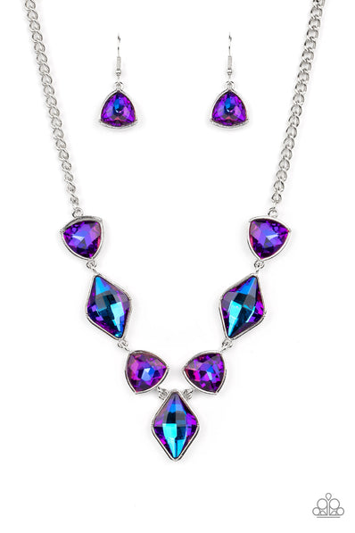Set in silver frames, glittering geometric purple shapes with a UV shimmer delicately coalesce around the collar for a statement piece. Features...