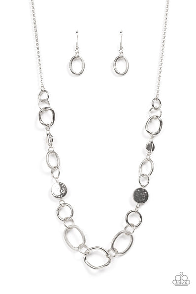 A mismatched assortment of hammered silver discs, textured silver links, shiny silver rings, and asymmetrical silver links boldly interlock below the collar...